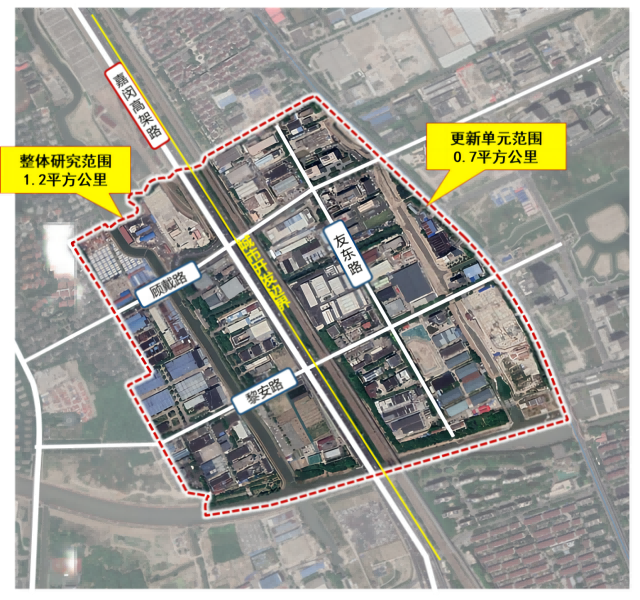 友东路片区整体研究范围为1.2平方公里,经过城市更新前期研究,最终明确更新单元范围为嘉闵高架以东0.7平方公里区域。具体四至范围为北至华崇路、东至中春路、南至淀浦河、西至嘉闵高架路。
