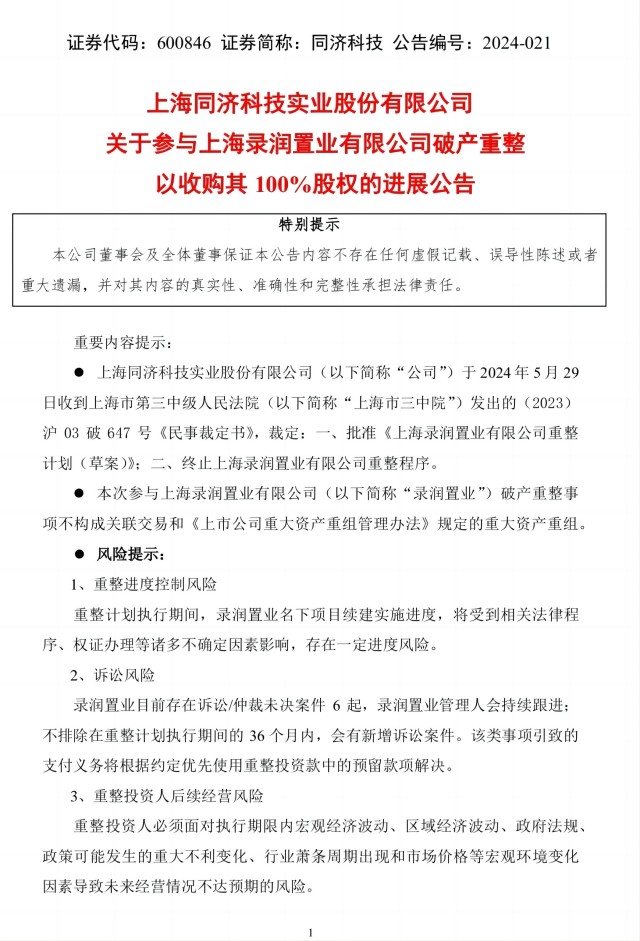 同济科技此前发布公告,同铖置业以不超过11.15 亿元的投资金额报名参与录润置业破产重整,收购录润置业 100%股权,以获得录润置业名下全部资产(包括新江湾城街道 412 街坊 9 丘的土地使用权和在建工程/建筑物、库存现金、车辆等)。 根据破产重整投资方案,不超过11.15 亿元的投资金额,包含了支付录润置业破产费用、共益债务、税款和职工债权、工程款优先债权、担保债权、普通债权及预留款项。