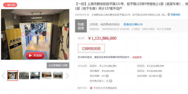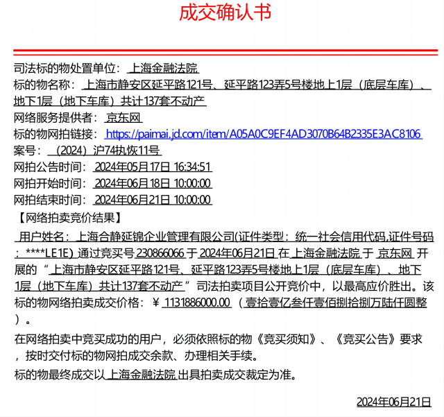 6月21日,位于延平路121号以及123弄的三和大厦在京东拍卖成功拍出,成交价格即起拍价格,11.31886亿元,此次拍卖的标的物建筑面合计45,179.96平方米,其中约37,600平方米为经营性面积,所以成交单价约为3万元/平方米。