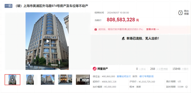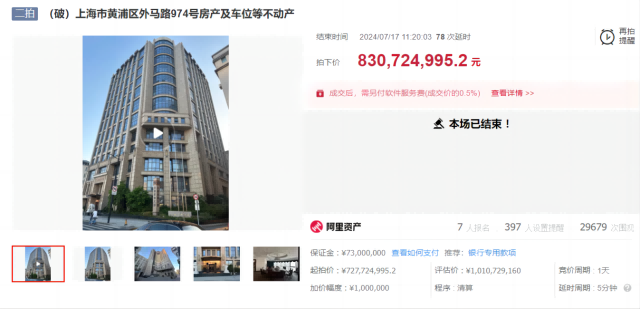 最终成交价即使是超过了第一次拍卖的流拍价,但还是远低于10.1072亿元的评估价。6月该宗房产一拍8.08亿元起拍,因无人报名流拍。
