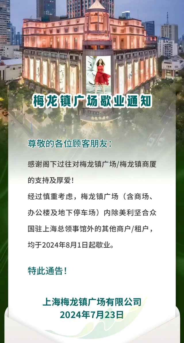 7月23日“梅龙镇广场”微信公众号发布消息:梅龙镇广场(含商场、办公楼及地下停车场)内除美国驻沪总领馆外的其他商户/租户均将于2024年8月1日起歇业。