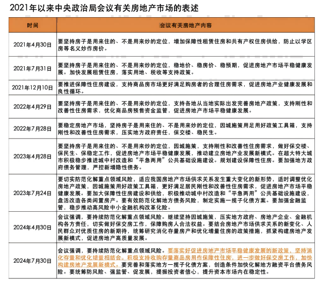 7月30日,中央政治局会议召开,分析研究当前经济形势,部署下半年经济工作。关于房地产,会议强调,“要持续防范化解重点领域风险。要落实好促进房地产市场平稳健康发展的新政策,坚持消化存量和优化增量相结合,积极支持收购存量商品房用作保障性住房,进一步做好保交房工作,加快构建房地产发展新模式”。